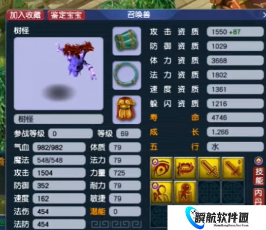这是一只59级玩家携带的树怪,这只宝宝他的技能不是很多只有6个,但是因为攻击资质实在是太高了,就被打成了一个瞬击的宝宝,我们看到他的攻击资质来到了1550点,加上87已经超过了1600点。
