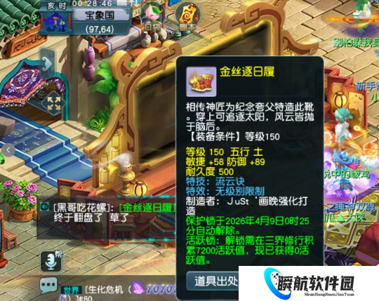 第二件让人满意的作品是这双140级鞋子,虽然属性为国标,但附带水清诀特技,瞬间化身成PK神装,非常适合自己的盘丝洞使用。