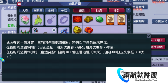 在线满20小时,终极福利到手。可选取1000仙玉冒泡框(30天)与400仙玉头像框(30天)中任选其一,仙玉品质装饰,让你在队伍、帮派、世界频道里一眼亮眼。挂机、做任务、逛三界……只要游戏客户端在线都算时长,不用刻意赶进度,轻松拿下高颜值限定装饰。