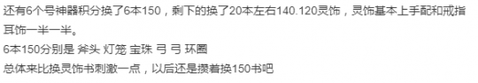 再就是神器积分,换了6本150的书以及20本的140和120级灵饰书,总的来说换150装备书要比换灵饰书更刺激一些。
