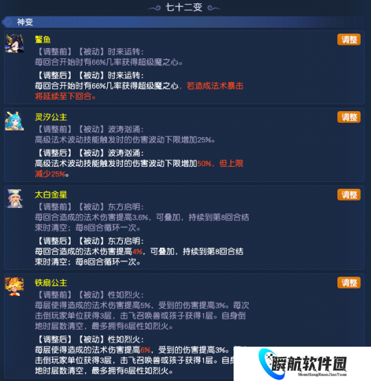本次调整中,七十二变系统“法系变身卡”迎来了一波小调整。鳌鱼变身若造成法术暴击,可延续之前获得的超级魔之心状态;灵汐公主的高级法术波动下限增加50%,但上限也减少了25%;太白金星每回合的伤害提升由3.6%变为4%;铁扇公主每次造成的伤害由之前的5%变成6%,最高可获动36%的增伤和18%的减伤,效果非常不错。