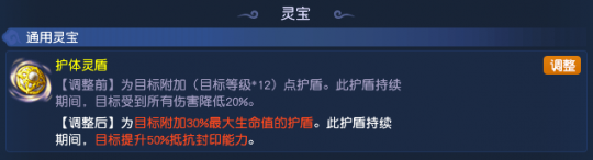 本次调整中,对灵宝“护体灵盾”的效果进行了调整。调整之后,该灵宝不仅能为目标附加30%最大生命值的护盾,还能提升50%抗封能力,无论任务还是PK,都嘎嘎好用!