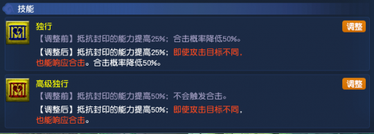 需要注意的是,这次还调整了“独行”和“高级独行”的技能效果。调整之后,即便攻击目标不同,也能响应合击。这就意味着,超级神狗的“第二春”要来了!