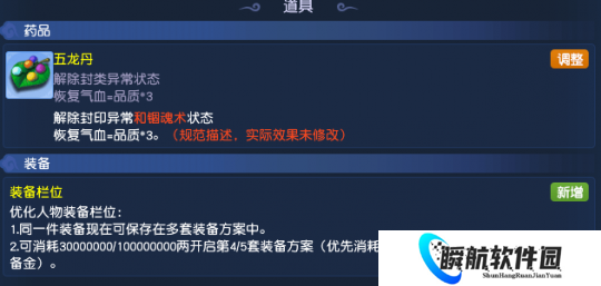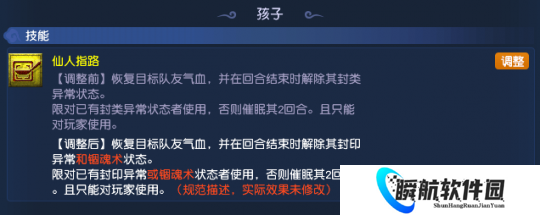 本次调整中,修改了孩子六艺技能“仙人指路”和五龙丹的效果描述,但实际效果没有改变,大家之前怎么用,现在还是怎么用。不过,这次调整之后,大家可以消耗梦幻币开启第四套、第五套装备方案!