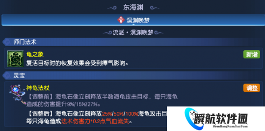 东海渊方面,龟之象的效果将受到瘴气影响,门派灵宝神龟法杖的伤害效果有所调整,虽然后期能力较之前有所提升,但操作起来要比之前更难一些。