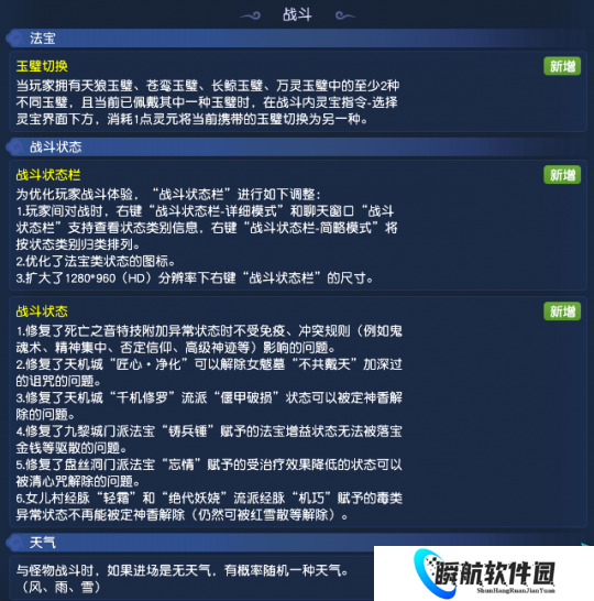 不过,法宝系统中,玉璧类型法宝新增“玉璧切换”功能,满足条件的玩家可通过消耗灵元的方式切换玉璧。另外,在与怪物的战斗中,如果进场时无天气,则有概率随机一种天气。