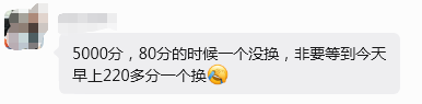 答题活动第一天的时候我就发文说了,活动结束的倒数第三至第五天是兑换的黄金期,基本就是除了活动前两天的最低分了。