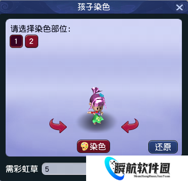 1)点击选项“给我的孩子改变形象”开启孩子染**面,可消耗“彩虹草”为孩子的默认造型进行染色;