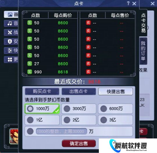 8、“寄售点卡”新增快捷出售功能,少侠可在“点卡-点卡交易”界面选择“快捷出售”进行操作: