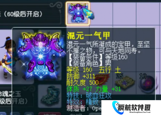 初始防御就达到了311点,距离非专用的极限,那也是不远了。另外还加了27点的体质和31点的力量。蓝字也是给力的,特技上面是破血狂攻,然后特效是一个精致。也就是说它能打到17级的月亮,这样的衣服一穿,综合属性提升就太高了。