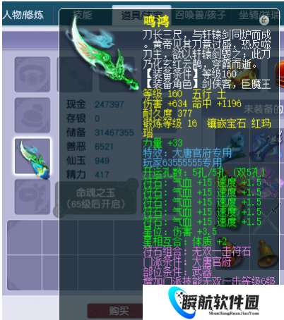 这个价值百万的大唐号上所带的160级的专用武器,仔细一看居然是服战级别的,因为它的基础伤害就有着634点,在打上16级的玛瑙石后,命中是到了1196点,同时在下排的附带属性上有着33点的力量加成。