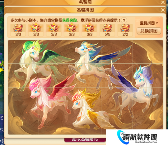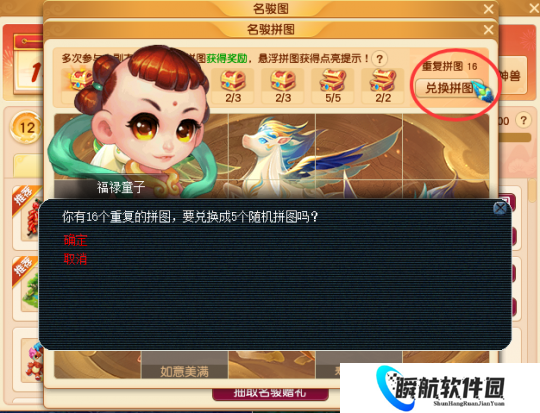 下面顺便给大家展示一下新春玩法的一些奖励,还有一些加速拿到奖励的小窍门。在小副本中,传统的方式就是按拼图提示去点亮碎片,但很多人忽视了右上角这个兑换拼图的选项,点击后可以把重复的三张卡片随机兑换成一张新的,虽然也有可能重复,但可以免去很多需要记的地方。