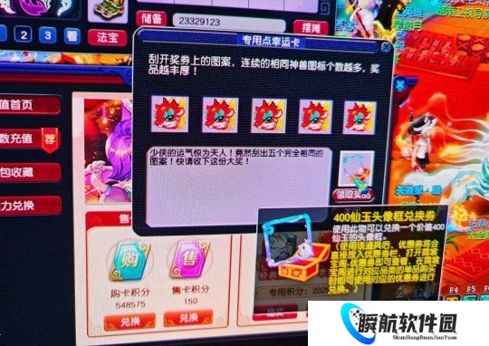 上面的是专用点幸运卡,这位玩家刮中的是5个相同神兽,拿到的是400仙玉头像框的兑换券。
