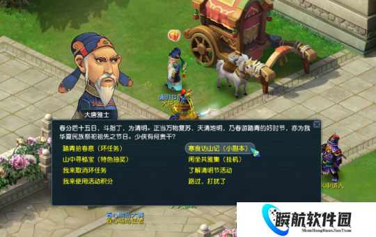 活动期间,玩家(角色等级 ≥ 50 级,5人组队)可在长安城(230,120)大唐雅士处选择"寒食访山记(小副本)"开启玩法。完成副本可获得丰厚的经验、金钱、物品与清明节活动积分奖励。