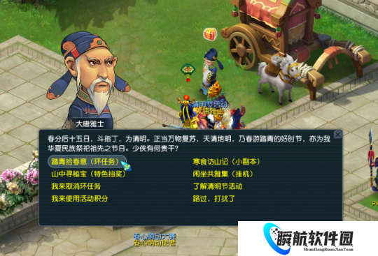 活动期间全天,玩家(角色等级 ≥ 30 级)可在长安城(230,120)大唐雅士处选择"踏青拾春意(环任务)"领取任务,完成即可获得丰厚的经验、金钱、物品奖励与清明节活动积分。