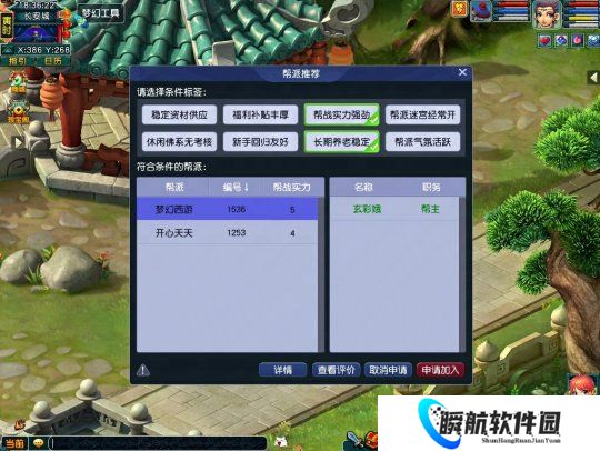 1)新增“帮派推荐”功能,在帮派主管处点击打开“加入帮派-帮派推荐”界面,系统将生成不同的帮派标签,玩家可通过选择帮派标签来筛选符合需求的帮派;