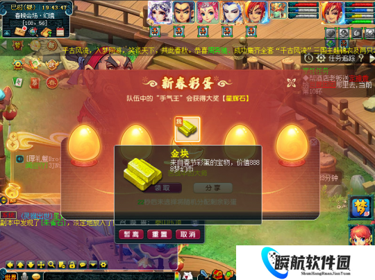 达成奇遇环的同时全员会开启砸彩蛋玩法,可砸出6666、8888、3W8梦幻币,其中3W8是最高奖励,相比往年各种物品还有8W8金钱而言,奖励是被削弱了。