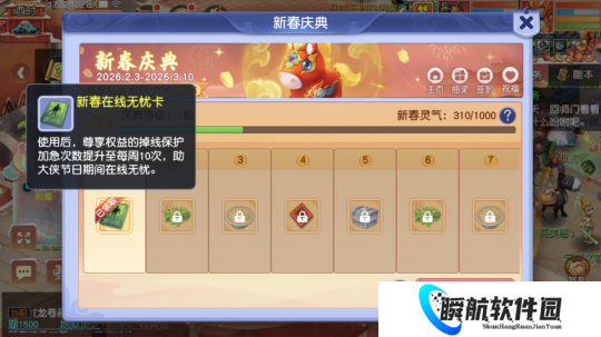 在新春庆典中可获得“新春在线无忧卡”,使用后,尊享权益的掉线保护加急次数由每周3次提升为10次。