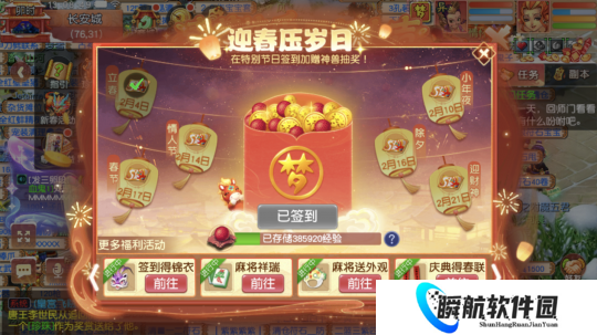 畅玩服2026春节活动中,立春(2月4日)、小年夜(2月10日)、情人节(2月14日)、除夕(2月16日)、春节(2月17日)、迎财神(2月21日)当天签到,除了获得20点活跃度外,还可以额外获得神兽抽奖券!