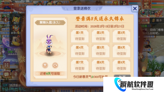 在2月13日至2月21日期间,登录满8天就送永久锦衣【舞狮头套】。刚好这个时间段,各位少侠要走访亲戚,上互通版签到更为方便。
