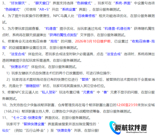 好友聊天、聊天窗口支持选择色弱模式。召唤兽修炼相关功能选项优化。机缘盘提示优化,这里问一下,大家角色的机缘是不是都满了?修复商会无法收购召唤兽“泡泡”的问题。法宝合成体验优化。快捷法术栏体验优化,2个技能调换位置,被替代的不会消失,这波是干事实了。修复NPC玄云道人相关问题。七十二变快捷变身界面优化,玩家可于“替换快捷设置”界面直接搜索并添加指定属性的“五行山神”、“巡山小妖”、“瑶池仙女”(例如“五行山神·金”)至“快捷变身”列表。
