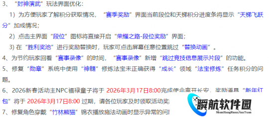 封神演武玩法优化。回看赛事录像新增加了“跳过竞技信息展示片段”。修复勋章系统重使用神髓修炼法宝相关问题。新春活动NPC将在3月17日离开,新年红包将在同天过期,大家记得及时使用。修复角色佩戴“竹林熊猫”锦衣问题。