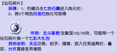 每次完成任务都能获得1-2个玲珑石,五个同色玲珑石可以合成一个仙石碎片,可以用来换取七彩大礼包,打开后可以获得经验、梦幻币、宝图、66、C66等各种奖励。