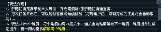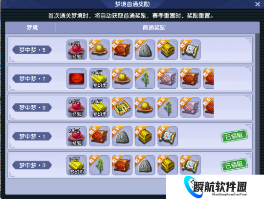 玩法奖励:每周首次体验可获得全额奖励;第2、3次奖励衰减且无物品奖励。赛季内首次通关梦中梦1、3、5、7、9层时,可获得对应首通奖励。