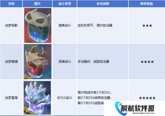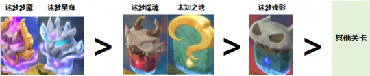 关卡优先级:以迷梦残影(50分)、迷梦噬魂(100分)、迷梦星海(200分)、迷梦梦魇(800分)、未知之地(200分)5类关卡为主,优先选高分关卡。
