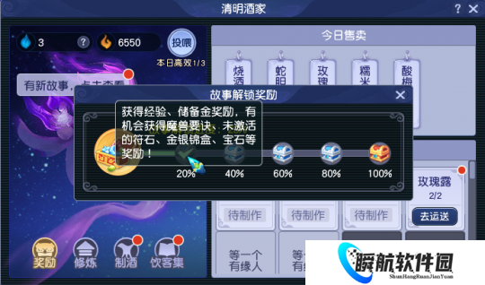 战斗的时候可以操作【清明酒家】,这样就方便很多。根据订单情况制作并解锁更高级的饮品,运送饮品后获得情思,解锁故事,通过修炼提升库存和订单量,不断操作即可。