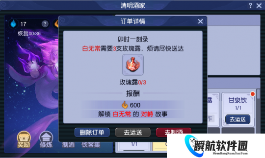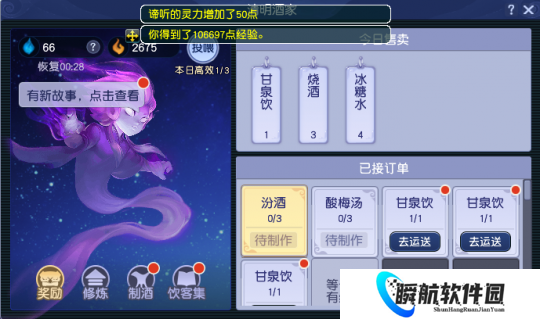 订单:玩家在线会持续获得订单,少侠只要根据提示制作,运送过去便能解锁对应NPC的故事。若是无法制作饮品,可以去解锁后再制作或者取消订单。