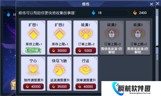 修炼:订单获得情思后,可以通过谛听修炼提升酒家和自身的各种能力,譬如增加库存和订单上限就比较实用。