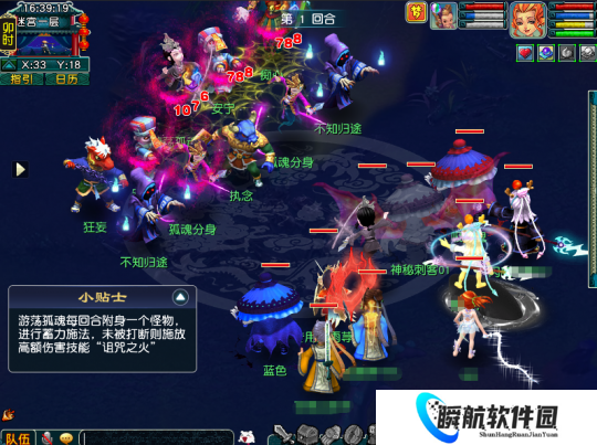 游荡孤魂BOSS是狮驼,变身后使用鹰击打面伤,可以被封印,但回合结束会自动解除。这关的特点是游荡孤魂每回合都会附身一个怪物身上,然后蓄力,若是下回合无法打断则会造成群体伤害。