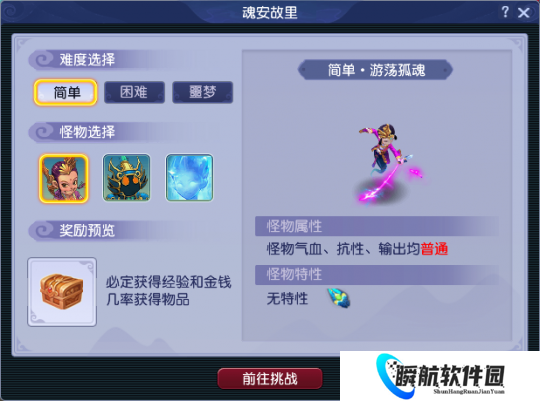 该挑战玩法共有3个BOSS,每名BOSS设有简单、困难和噩梦三个难度,少侠可自选难度进行挑战。成功挑战不同难度可解锁对应品质的宝箱 。