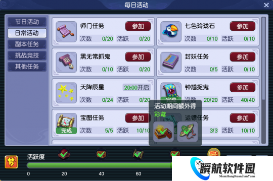 活动期间,≥30级的少侠活跃度达到40和80时,可分别领取纸鸢和彩鸢。