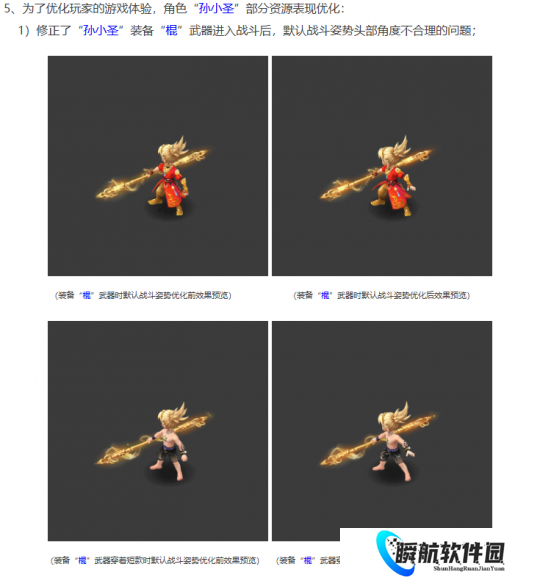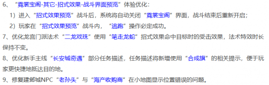 修复新角色孙小圣显示情况,优化“霓裳宝阁-其它-招式效果-战斗界面预览”体验,优化龙宫技能二龙戏珠使用笔走龙蛇招式效果,优化“长安城奇遇”新手主线任务描述,修复建邺城NPC小地图显示错误问题。
