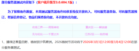 下面是测试服的维护情况:新一年的植树节活动即将开启,植树节活动分为环任务、挑战怪、单人特殊玩法、挂机得经验几种玩法模式,刷经验的大佬环式任务每天肯定是要拉满的。