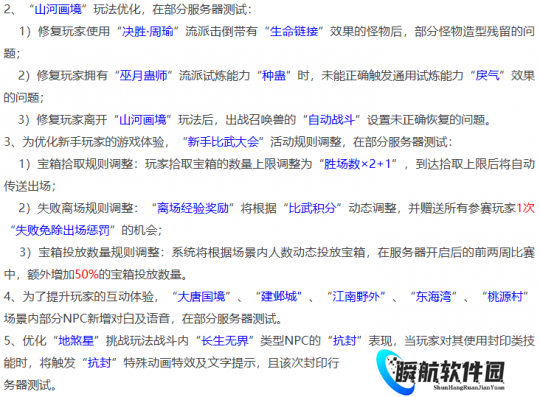 测试服四连优化:优化山河画境玩法,修复相关流派技能情况,优化新手玩家游戏体验,新手比武大会活动规则调整,提升玩家互动体验,部分场景NPC新增对白及语言,优化地煞星战斗内长生无界类型NPC抗封表现。