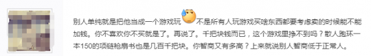 见此,立刻有玩家跟帖反讽,表示吐槽散人买梦幻锦衣的才是智商堪忧,别人平时该省省该花花,喜欢方天画戟,愿意花1000购买是个人的喜好和消费观,至于卖号能加多少人家也不在乎,自己没有独立思考能力就不要胡乱批判。