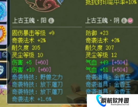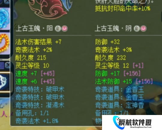 双速度一法结带1.8%奇袭法术的前排玉魄,后排是双防御一法防带物伤化劲3.2%的后排玉魄。