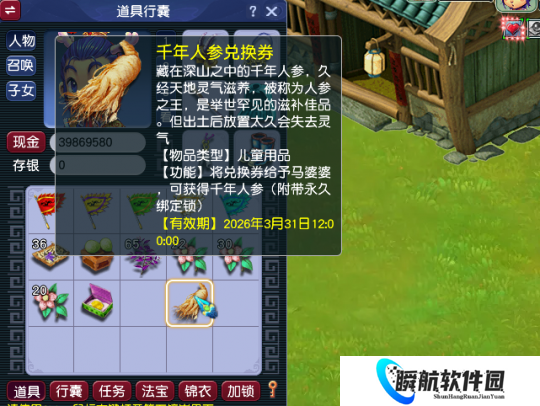 另外,【千年人参】等子女养成道具均将以兑换券的形式发放。玩家可在子女系统开启后,前往长寿村(43,71)马婆婆处兑换相应道具。