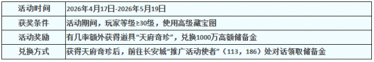 天府大地蕴藏无穷宝藏,下一铲,说不定就是你!活动期间,使用高级藏宝图挖宝,即有概率额外获得稀世道具——天府奇珍!此物只应天府有,巴蜀秘宝藏玄机,珍稀度直接拉满!集齐上交,即刻兑换1000?万高额储备金,让全服少侠见证你的欧气时刻!