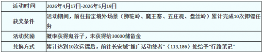 边押镖边薅宝,阵法&战力双丰收!新服活动期间,参与「蜀道难」专属挑战,押镖往返大唐境外(狮驼岭、魔王寨、五庄观、盘丝岭)累计10次,可获得行路笔记,上交笔记概率获得鬼谷子!开启即得?PK?神器、任务必备,如虎添翼。押镖不亏、本本血赚,助力少侠蜀道关关过!