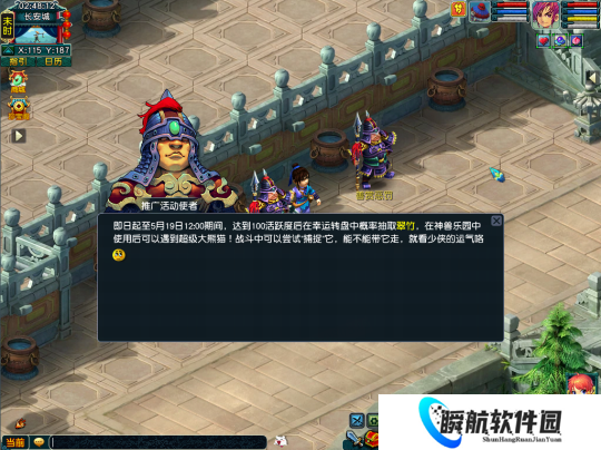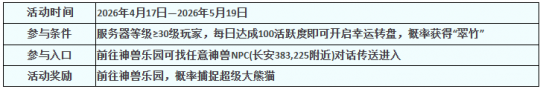 滚滚相伴,萌翻全场!活动期间,服务器等级≥30级玩家,每日达成100活跃度即可开启幸运转盘,概率获得“翠竹”道具。传送至神兽乐园,使用“翠竹”后即可在乐园内偶遇超级大熊猫(触发战斗),战斗中可以尝试“捕捉”它!说不定,幸运锦鲤就是你!