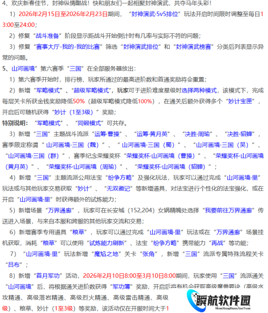 春节期间封神演武玩法时间调整,每日13点至24点都可以参加。山河画境第六赛季“三国”全服开放,今年的嘉年华锦衣也是三国系列,从这点来看,今后可以展望水浒、红楼系列等锦衣。