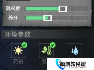这里放「泥土」是因为它的疏松度和营养进度条是一致的方便调节,而且不算低在 20% 左右,这里就不放图了,大家自己游戏里看。