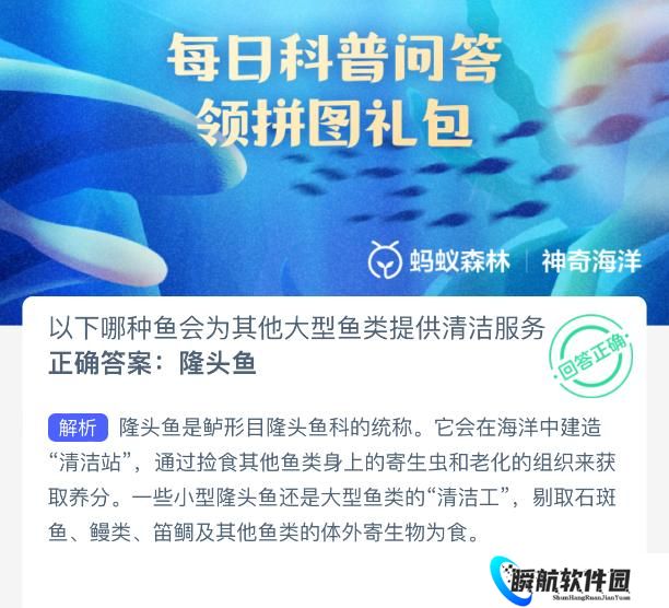 以下哪种鱼会为其他大型鱼类提供清洁服务?【神奇海洋】11月6日新题目已开答!正确答案现已公布,点击领取拼图,一起为修复海洋生态贡献力量!今日正确答案是:【隆头鱼】。隆头鱼是鲈形目隆头鱼科的统称。它会在海洋中建造“清洁站”,通过捡食其他鱼类身上的寄生虫和老化的组织来获取养分。