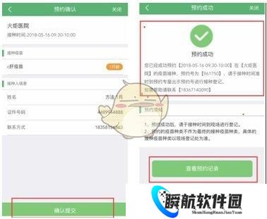 选择接种时间后,进入“预约确认”界面,用户对预约信息进行确认,若预约时间段、接种机构、疫苗选择等信息选择有误,可返回对应选项修改,若信息正确选择“确认提交”,弹出“预约成功”的界面。