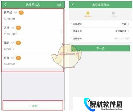 如果没有,选择“选择预约人”界面下面的“添加”,进入“家庭成员添加”界面,进行适龄儿童家庭成员的添加。