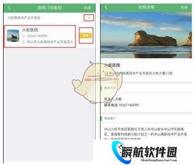 选择预约人,进入“选择门诊医院”界面,根据用户实际情况选择门诊,点击“▽”可以获取更多门诊。